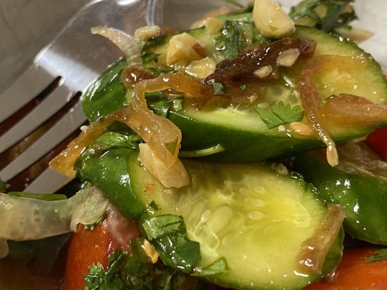 Notes from Jaimie Wilson: Don’t skimp on the fried shallots. That’s what makes this. I fried my own because I only had fresh. But the Asian stores have fried garlic and shallots. I used a Hungarian wax pepper. The herbs were Thai basil, Italian basil and cilantro. Ideally, i would have swapped the Italian basil for dill, but my dill had rotted. boo. I also followed the advice sidebar and doubled the Thai dressing. I have been eating it with baby cukes for days.