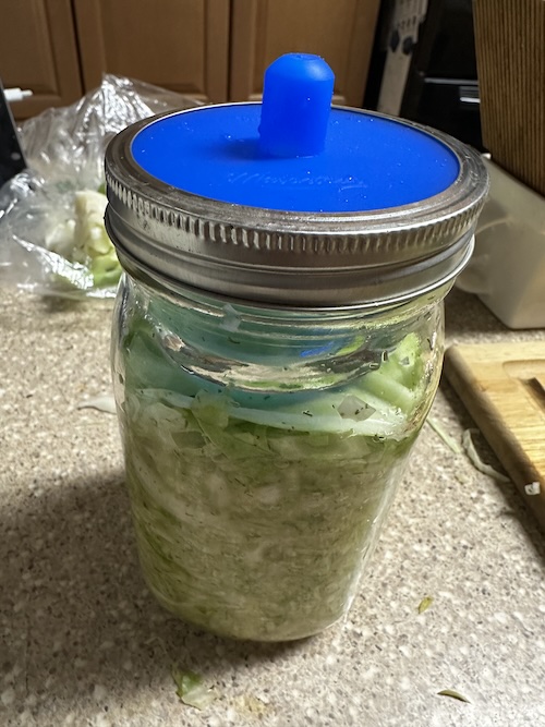 - Once the sauerkraut reaches your desired flavor and texture, remove the Pickle Pipe and replace it with a regular mason jar lid. Store the sauerkraut in the refrigerator, where it can keep for several months.