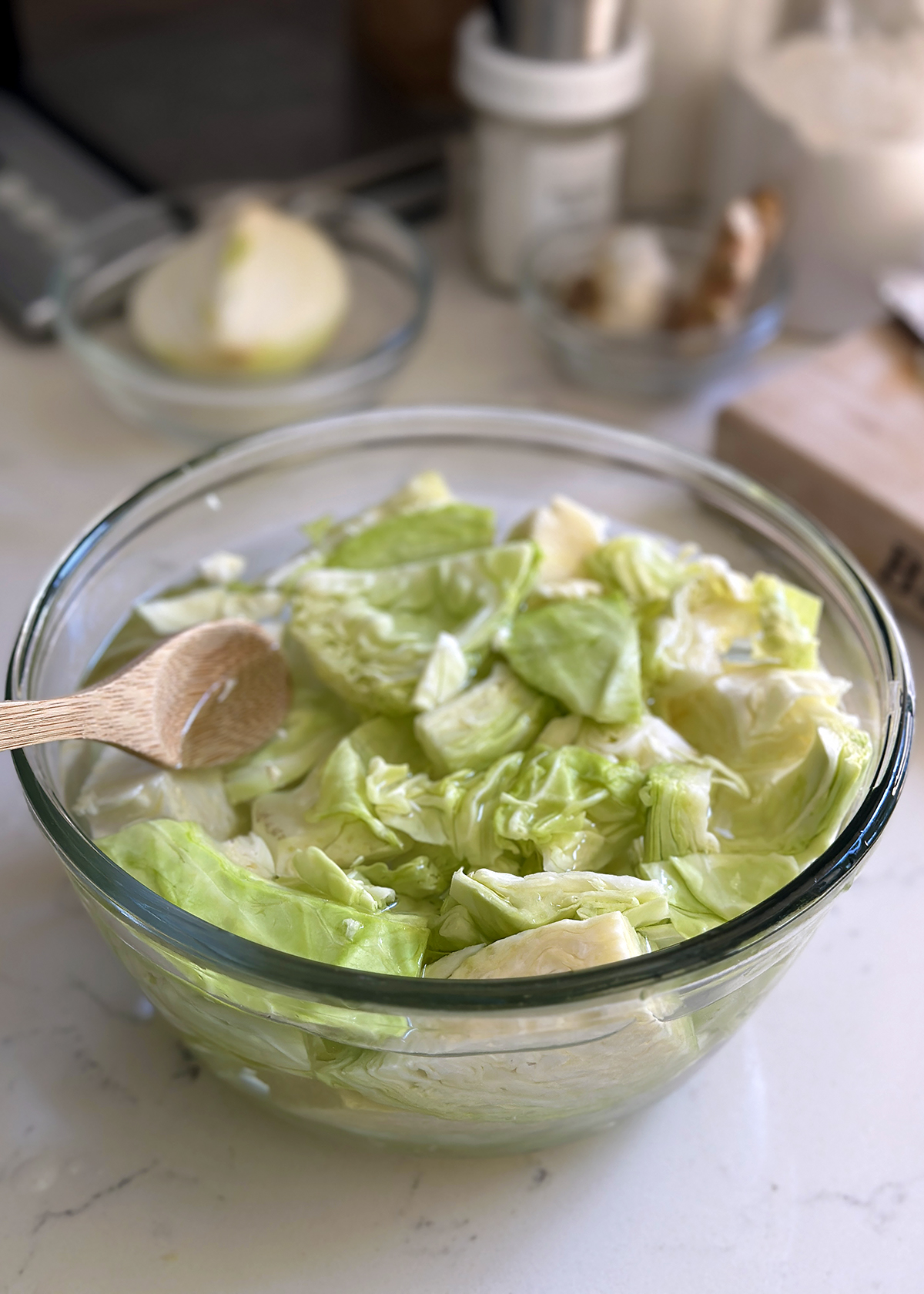 - Massage and muddle cabbage until salt is worked in and it starts to release juice.